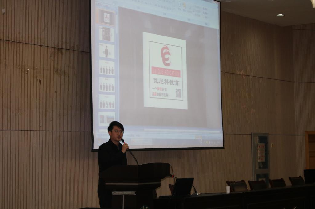 首先,唐老师为同学们简单介绍了孙秀龙校长以及他的公司优尼科教育连锁机构,之后便由孙校长为同学们开讲。孙校长并没有过多赘述他的创业经历,而是给同学们讲了4个小故事,从这几个故事中孙校长向我们传达了他所想表达的,也就是我们应该思考,不论是在大学生活中还是在今后的社会生活中我们都应该思考,思而后行,方得始终。